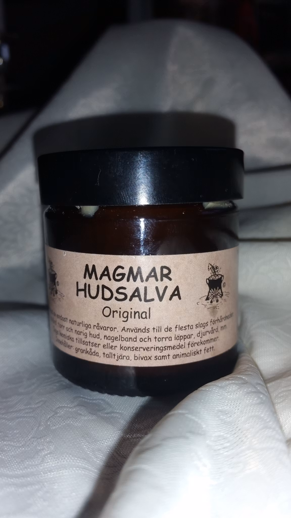 Magmar Hudsalva är gjord på grankåda, tjära, bivax samt animaliskt fett.